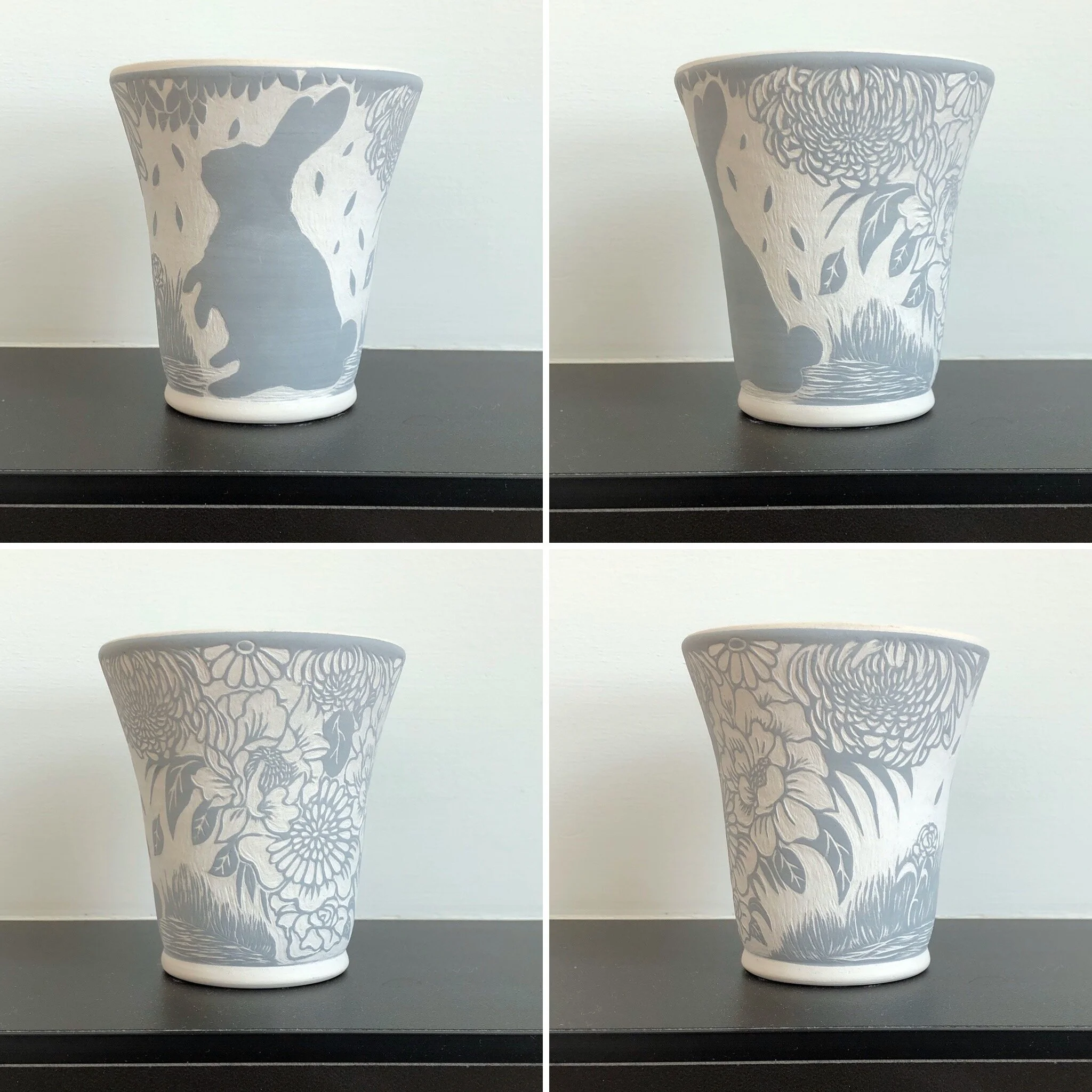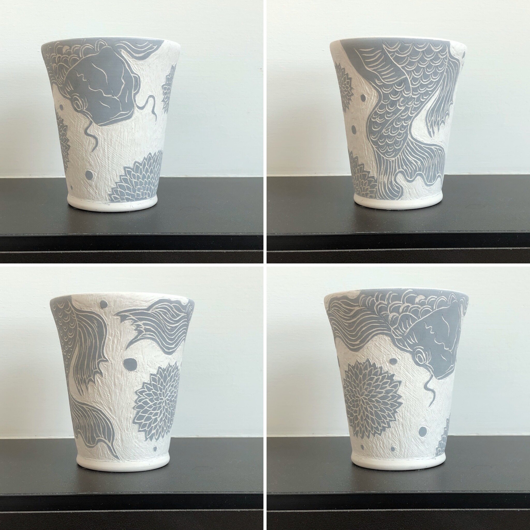 These cups are carved for The People’s Cup art project created by SILT Studio, Regina, Canada. This project was born out of the COVID-19 pandemic. Each cup is hand-thrown by Jay Kimball at SILT Studio, with the surfaces designed and carved by local artists/makers.